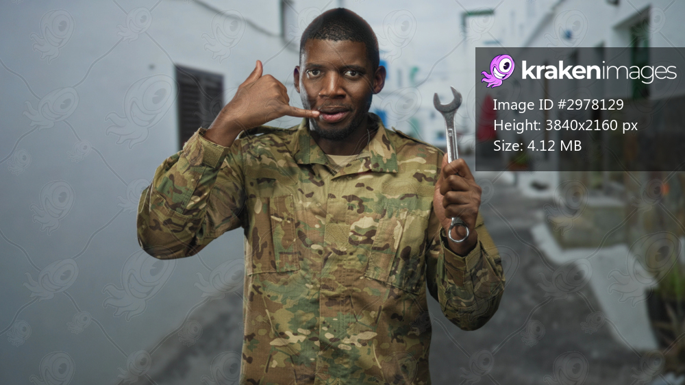Man soldier in camouflage uniform holding wrench and making call hand sign on a narrow whitewashed street with buildings; pride duty.