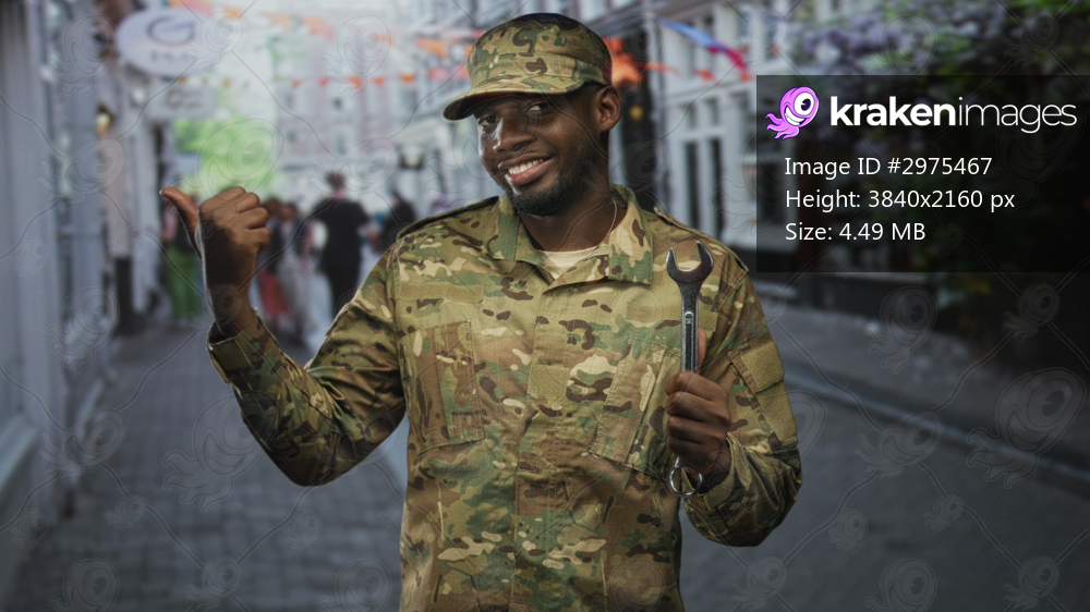 Man soldier in camouflage uniform holds wrench and gives thumbs up while pointing over shoulder on a cobbled street, smiling; pride duty.