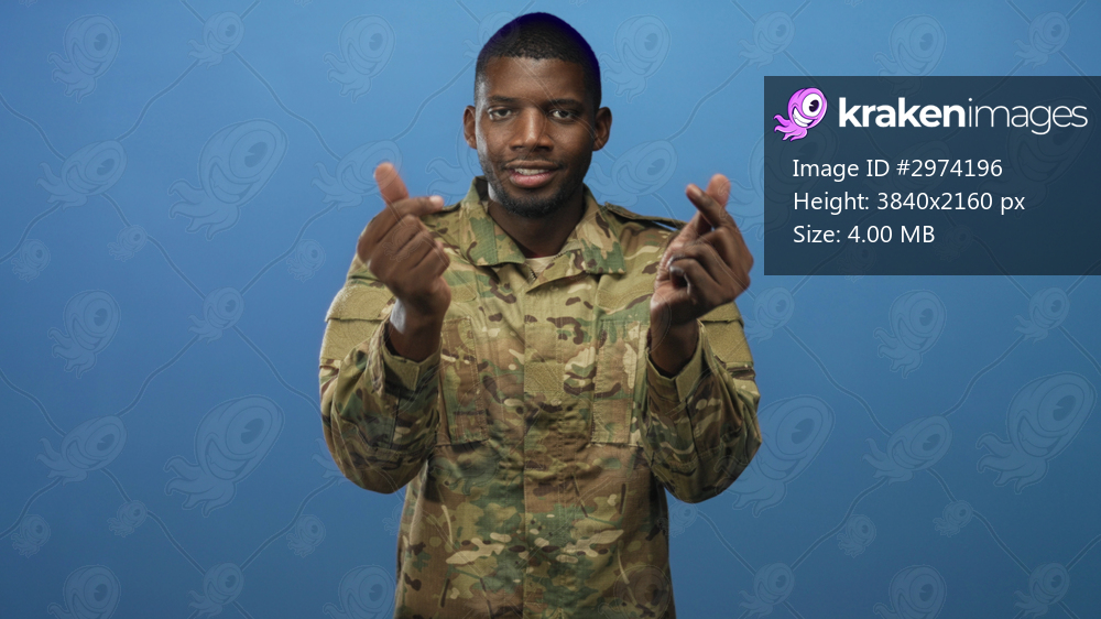 Man soldier in camouflage uniform makes finger heart with hands in studio, smiling at camera; pride duty.