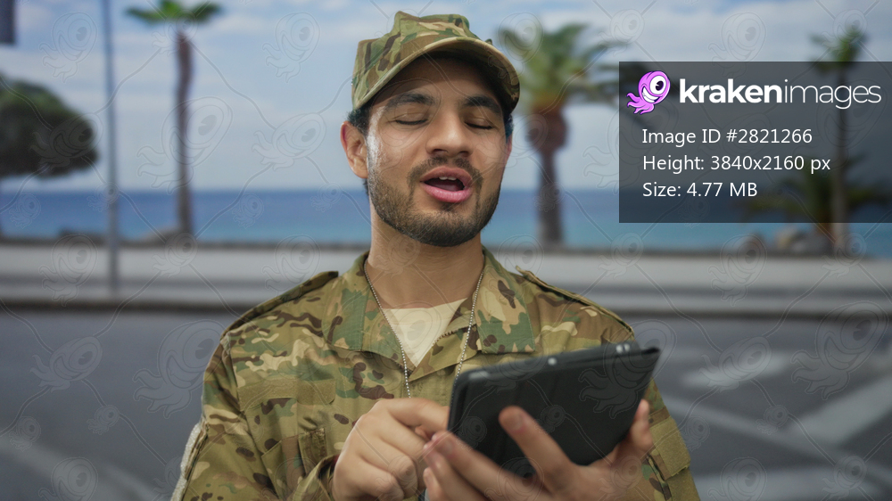 Man soldier in camouflage uniform taps tablet screen while wearing dog tags on seaside street; duty readiness.