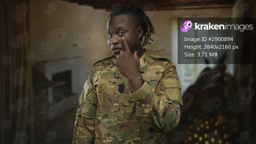Man soldier in camouflage uniform with visible dogtags points finger near face in a living room building with curtains and window light; duty confidence. - Kraken Images
