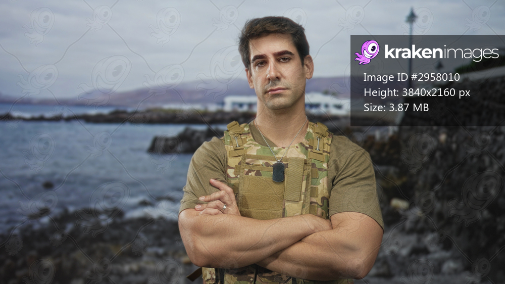 Man soldier in camouflage vest with crossed arms and visible dogtag by stone wall on a coastal street; duty determination.