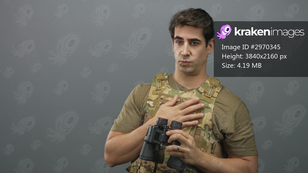 Man soldier in camouflage vest holding binoculars with both hands and one hand pressed to chest in studio; duty reflection.