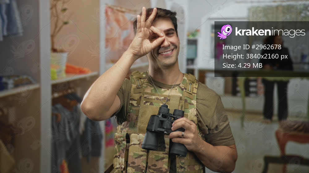 Man soldier in camouflage vest holds binoculars, smiling and makes ok sign to eye inside a clothing shop building with racks, mannequin and counter visible; playful duty. - Kraken Images