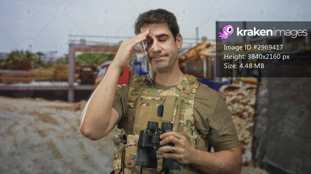 Man soldier in camouflage vest holds binoculars to eyes and then rubs his forehead while standing near a building construction area; fatigue vigilance duty. - Kraken Images