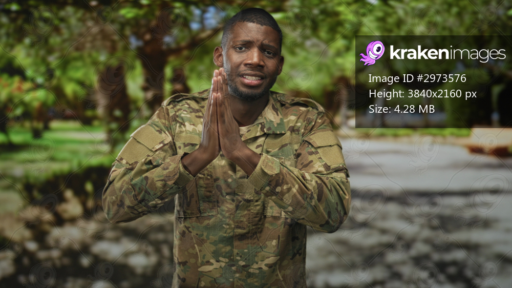 Man soldier pressing hands together in prayer gesture showing palms and fingers in forest path with bench behind; duty honor hope resilience.