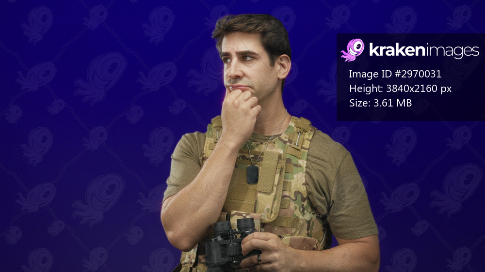 Man soldier standing holding binoculars and dog tags with hand on chin wearing tactical vest in studio; thoughtful reflection.