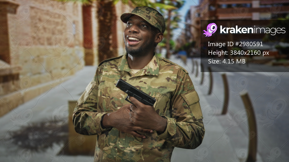 Man soldier wearing camouflage uniform and cap holding pistol with hand on chest on street near buildings and bollards; pride duty.