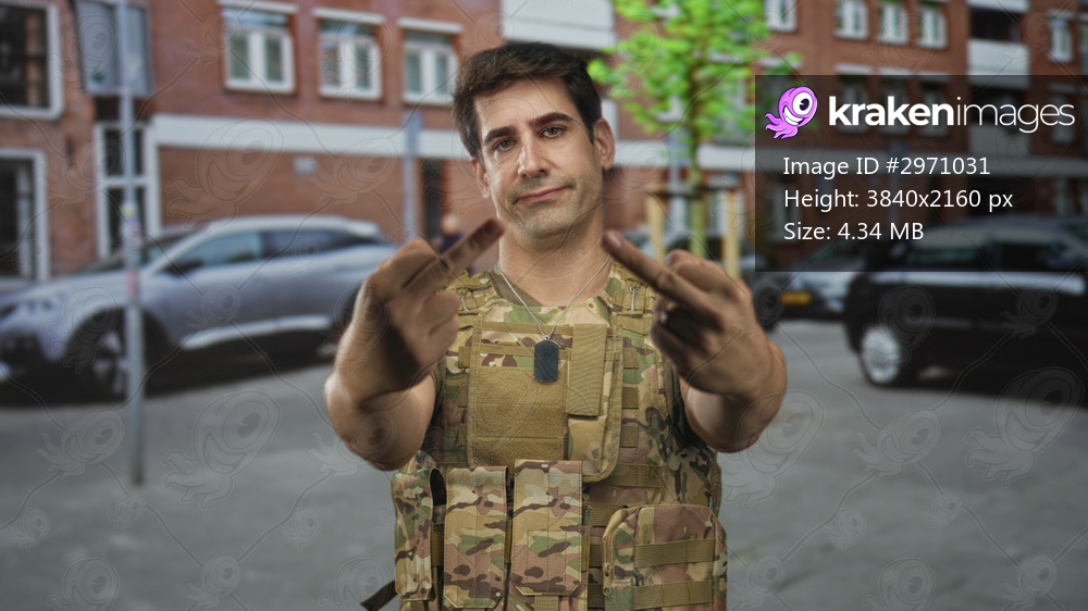 Man soldier wearing camouflage vest and dog tags flipping middle fingers on a street by brick apartment buildings; defiance protest.