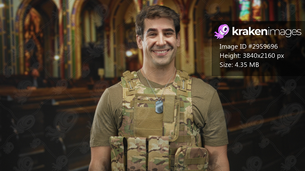 Man soldier wearing camouflage vest and dog tags, smiling with a slight head tilt and visible face while standing inside a church building; pride duty. - Kraken Images