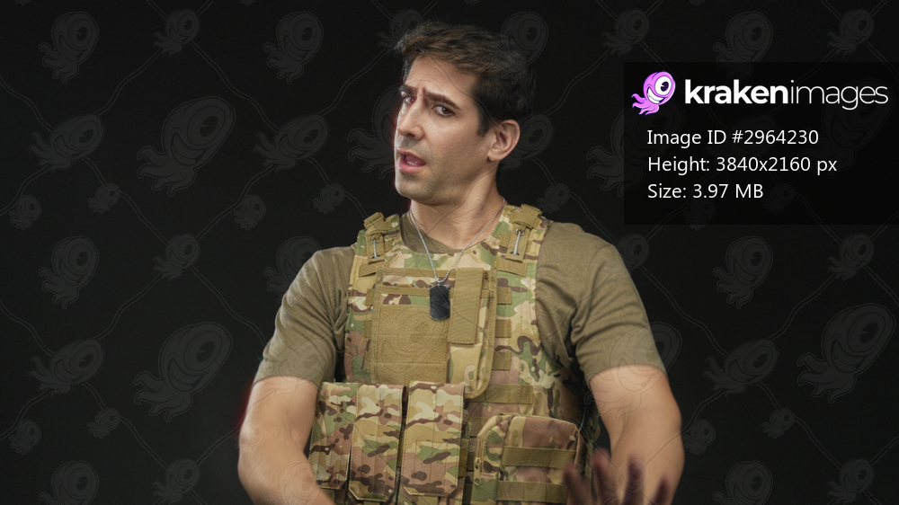 Man soldier wearing camouflage vest raises hands, palms out, signaling stop in studio and showing dogtag and tactical vest; alert duty.