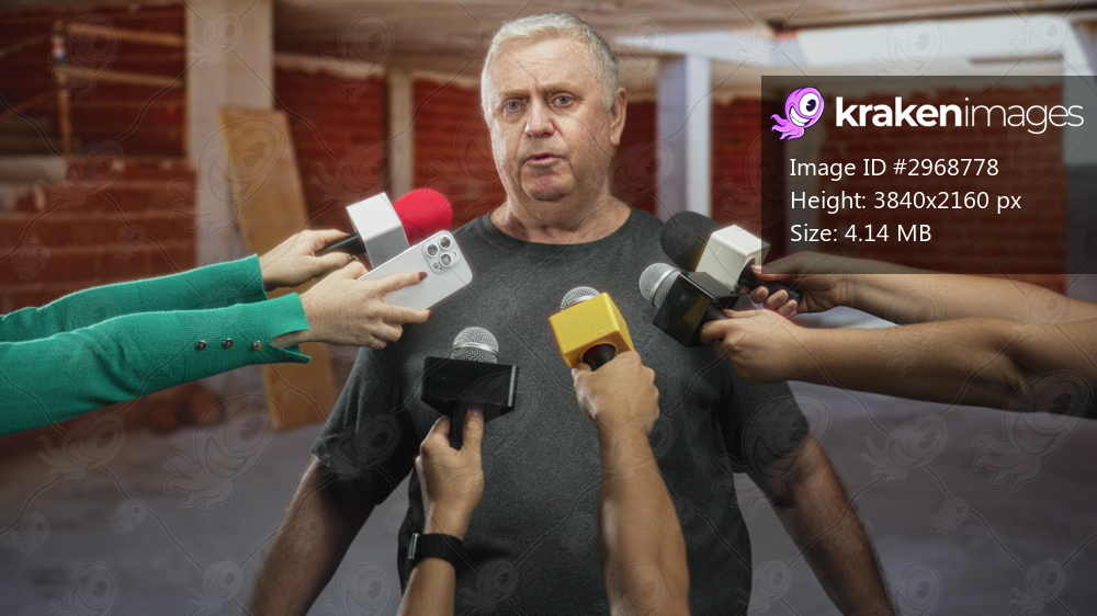 Man speaks into multiple microphones while reporters hold mics and a smartphone near his face in an unfinished building; public scrutiny concern.