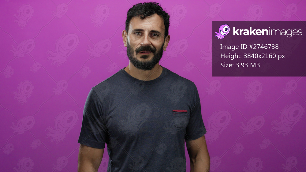Man standing against a vibrant pink background, wearing a casual grey shirt, exuding confidence and calmness, his dark beard and hair complementing the bright setting. - Kraken Images