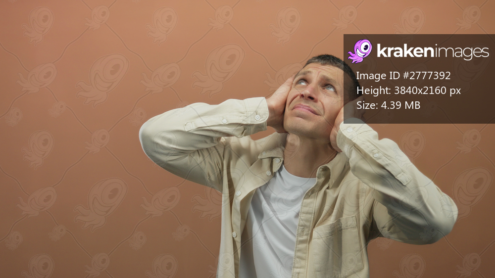 Man standing against brown wall with hands covering ears, expressing discomfort in isolated background.