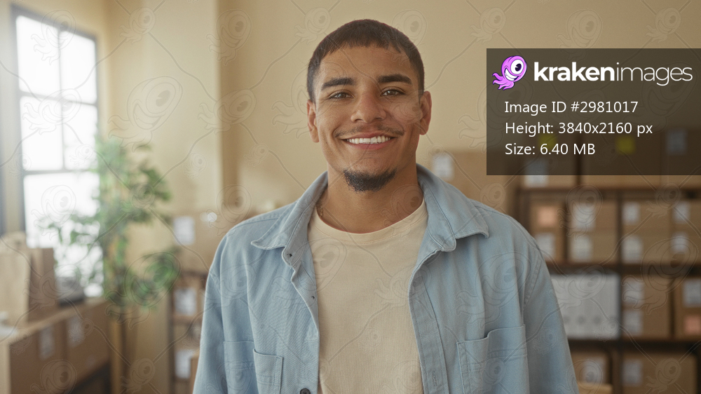 Man standing among stacked boxes, smiling with face visible and looking to side in building; confidence entrepreneurship.