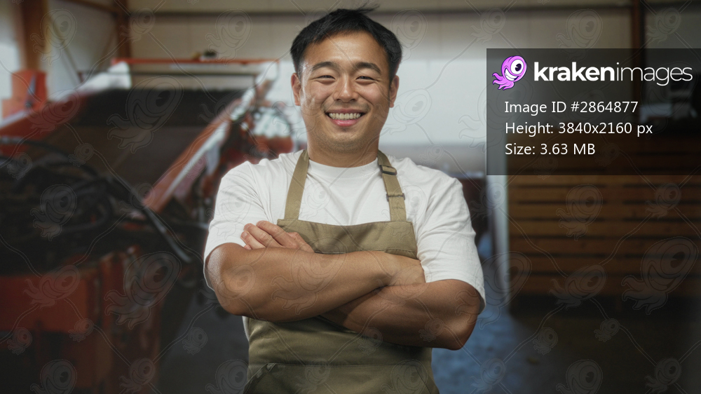 Man standing with apron and arms crossed smiling in studio against blurred machinery; confidence pride ambition determination.