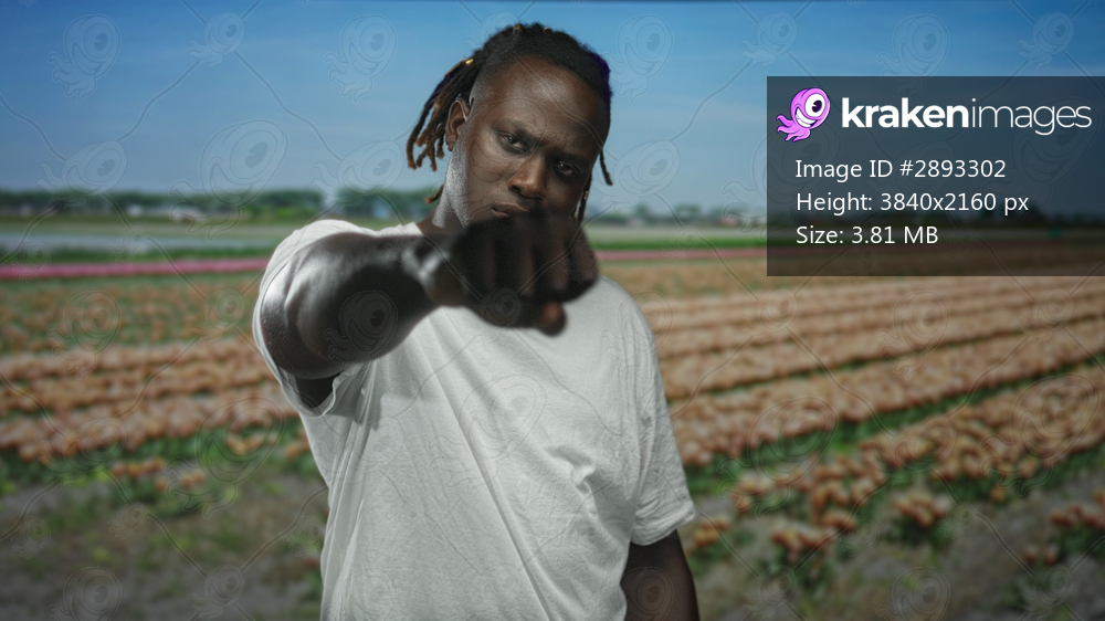 Man standing with arm across chest in a flower field wearing white t shirt, visible forearm and direct gaze; resilience growth.