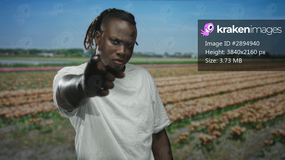 Man standing with arm across chest in a flower field wearing white t shirt, visible forearm and direct gaze; resilience growth.