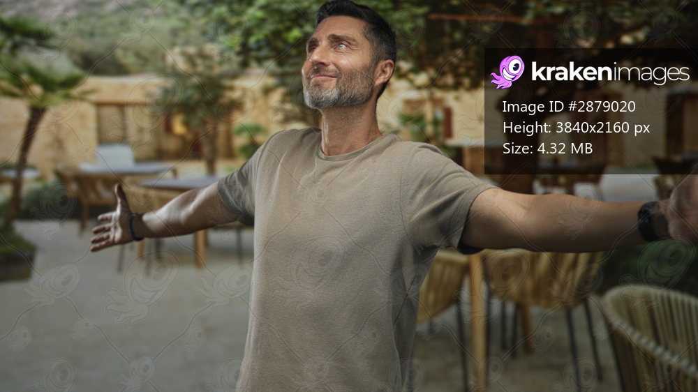 Man standing with arms outstretched and open palms on a restaurant terrace near a building; contentment gratitude.