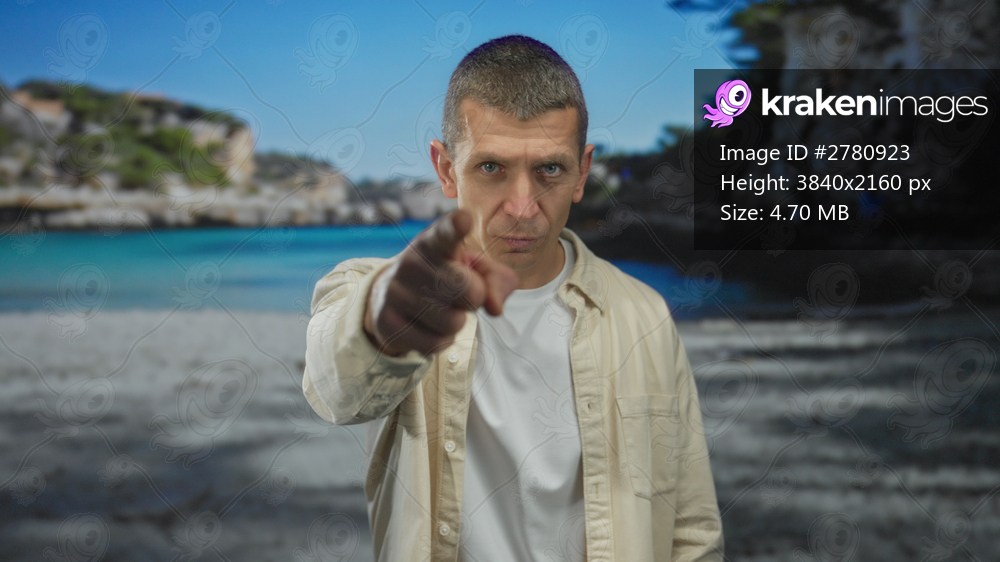 Man standing at the seaside with beach background, wearing casual white shirt, exuding confidence and pointing at the camera on a sunny day.