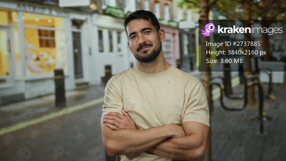 Man standing confidently on urban street with arms crossed, wearing casual beige shirt and smiling under autumn trees in city setting.