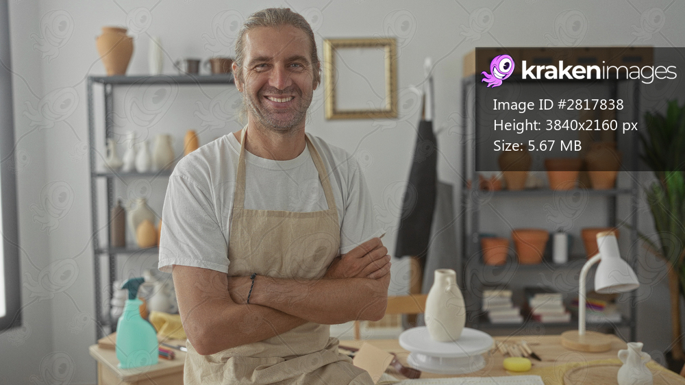 Man standing with crossed arms beside ceramic vase in pottery studio; creativity focus confidence pride.