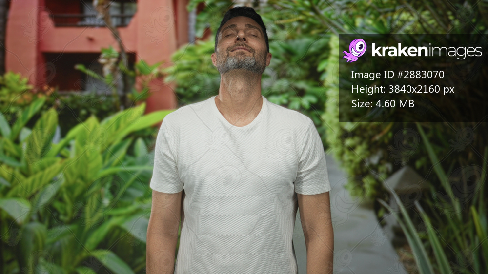 Man standing with eyes closed and head tilted back by lush green plants and a building walkway; serenity.