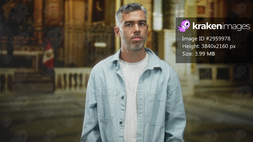 Man standing face forward wearing light blue jacket inside ornate building with visible flag and neutral gaze; quiet contemplation.