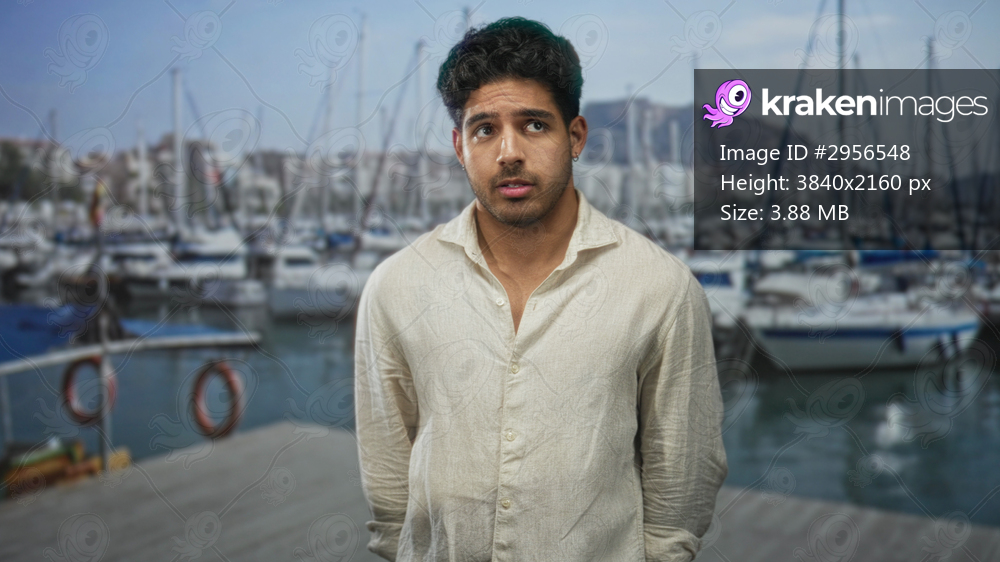 Man standing with hands in pockets and slight head tilt on marina dock with moored boats and city skyline; pensive solitude.