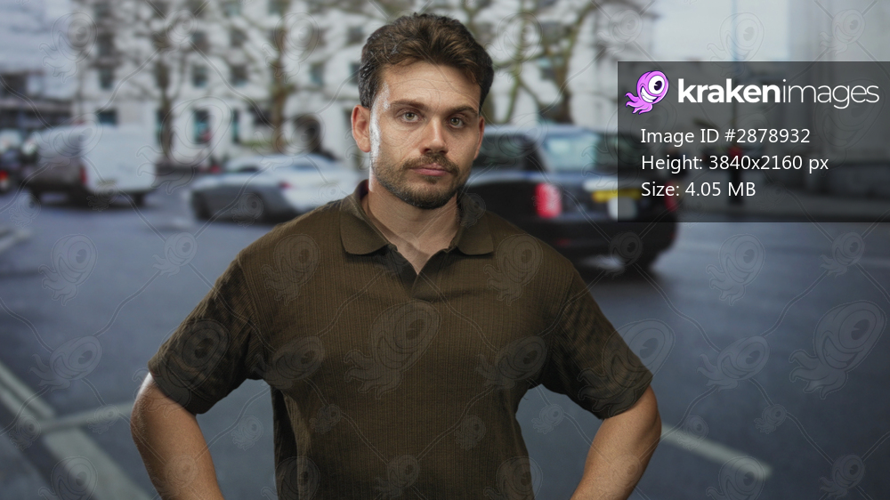 Man standing with hands on hips in a busy city street wearing a brown polo shirt among taxis and vans and parked cars; annoyance.
