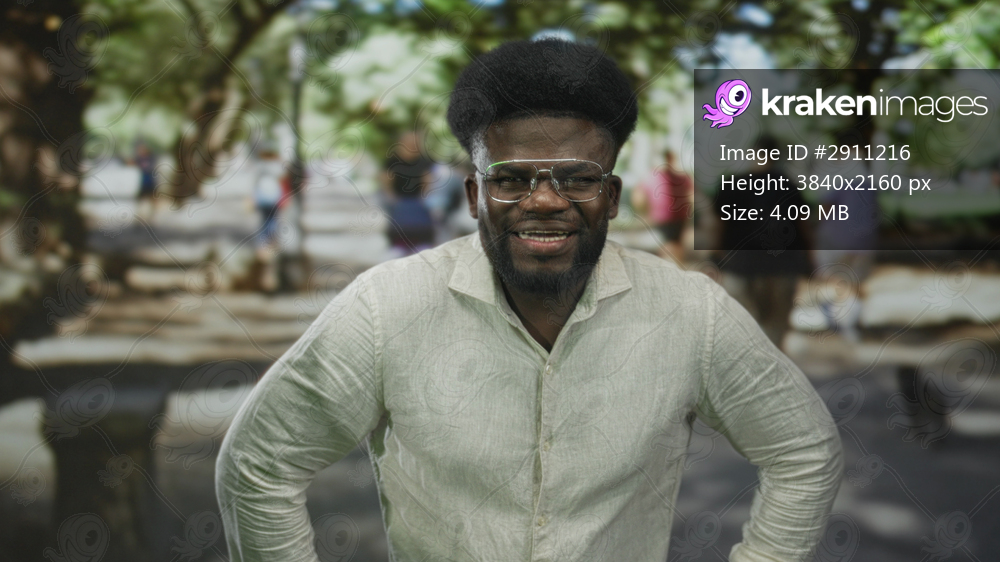 Man standing with hands on hips in park wearing glasses and linen shirt, facing camera amid blurred trees and walkers; confidence leisure.