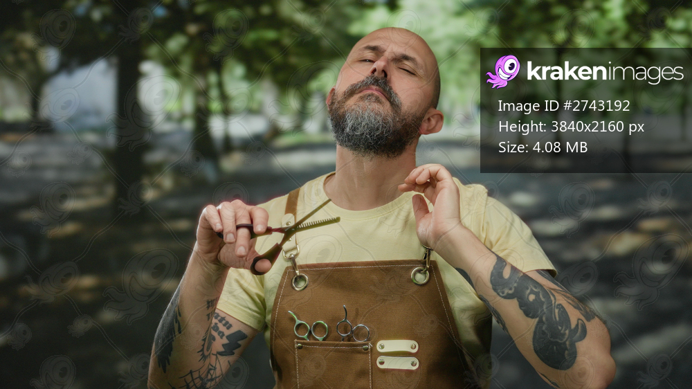 Man standing in a sunny park outdoors, wearing apron and holding scissors with a thoughtful expression, surrounded by greenery.