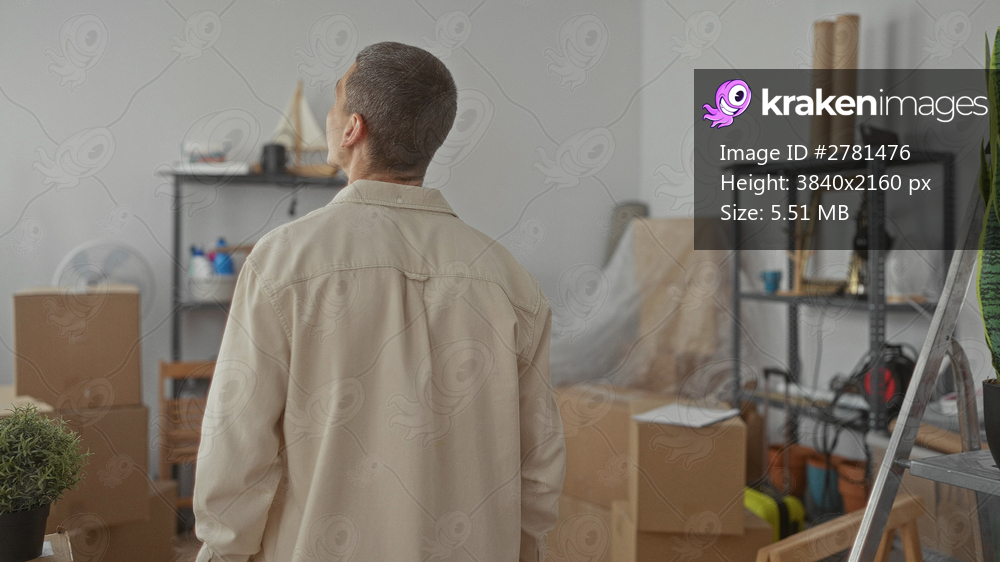Man standing in living room of new apartment surrounded by boxes and shelves while smiling and relaxed