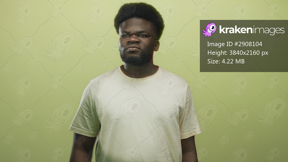 Man standing in studio green wall wearing white t shirt grimacing with raised shoulders and direct stare; uncertainty frustration.