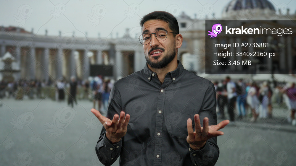 Man standing in vatican city square with expressive gestures, surrounded by historic architecture and tourists in the background, wearing glasses and a casual shirt. - Kraken Images