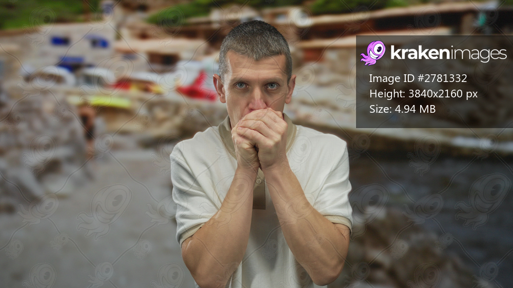 Man standing on a beachside with blurred seaside background appears cold, wearing a white shirt, suggesting a chill seaside atmosphere and contrasting the usual warm coastal setting. - Kraken Images