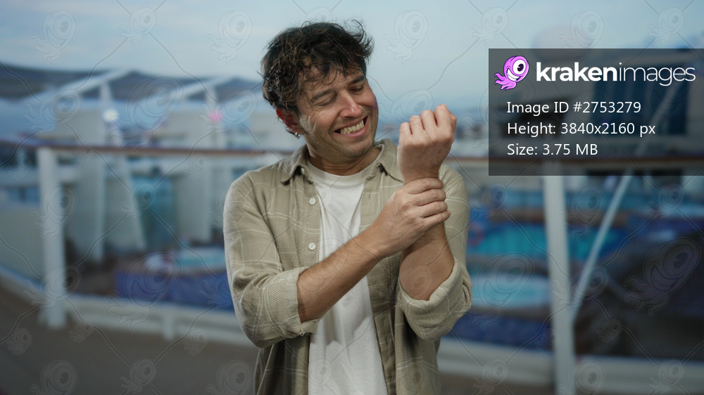 Man standing on a cruise ship deck appears contemplative and concerned, looking at his wrist against a background of modern ship architecture and clear skies. - Kraken Images