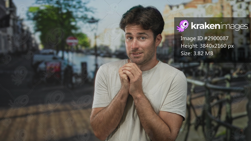 Man standing on an amsterdam street with hands clasped to mouth and tense expression near canal bicycle and railing; anxiety.