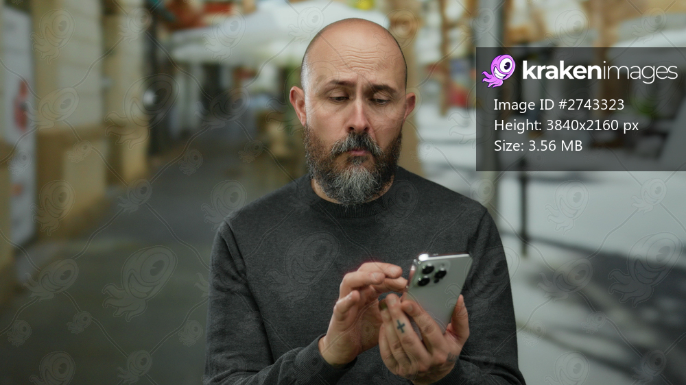 Man standing on an urban street, focused on using a smartphone with a serious expression, surrounded by a blurred city background.