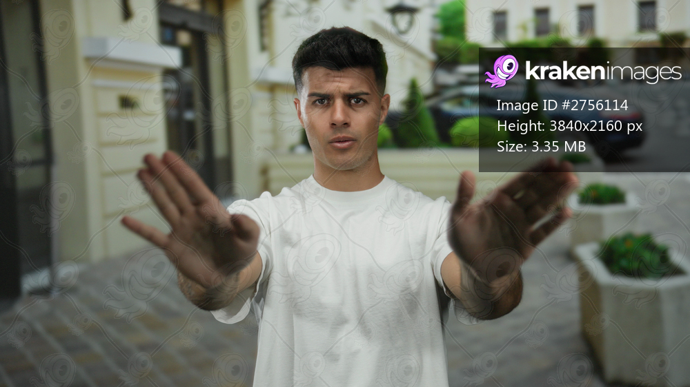 Man standing on city street with hands raised as if signaling stop wearing a white shirt in an urban setting on a sunny day showcasing expressive body language and serious expression. - Kraken Images