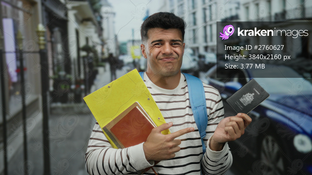 Man standing on city street holding canadian passport and pointing with a thoughtful expression, surrounded by buildings and cars, suggesting travel contemplation. - Kraken Images