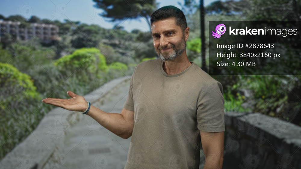 Man standing on forest path beside stone wall presenting open palm toward camera wearing beige t shirt and bracelet, smiling; serenity.