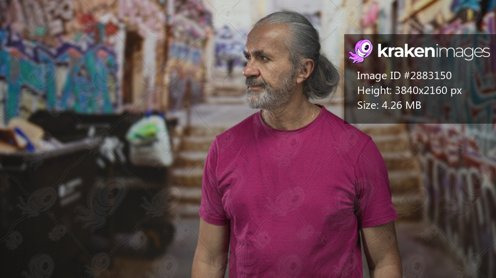 Man standing on street among graffiti walls, looking sideways with long grey hair and beard, wearing pink t shirt; urban solitude.