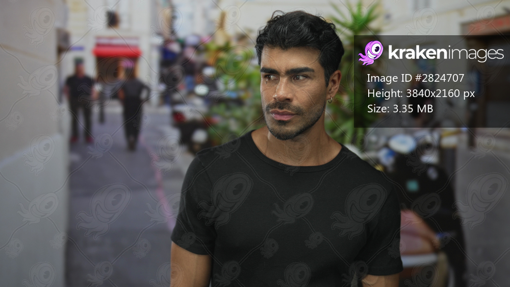 Man standing on street showing face under natural sunlight with buildings in background; confidence.