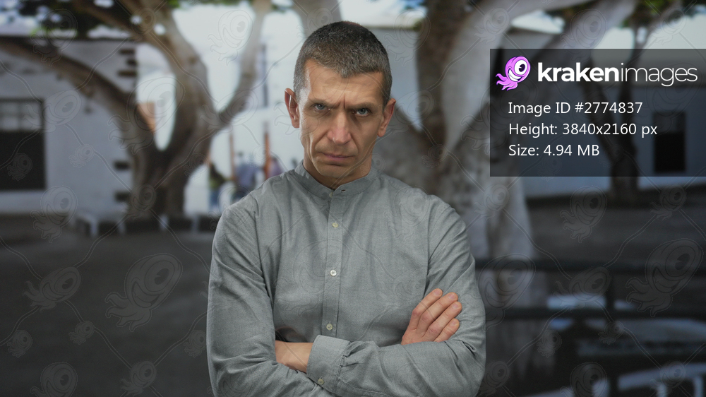 Man standing outdoors with arms crossed under tree-lined street, displaying contemplative expression against urban backdrop with blurred people in background. - Kraken Images