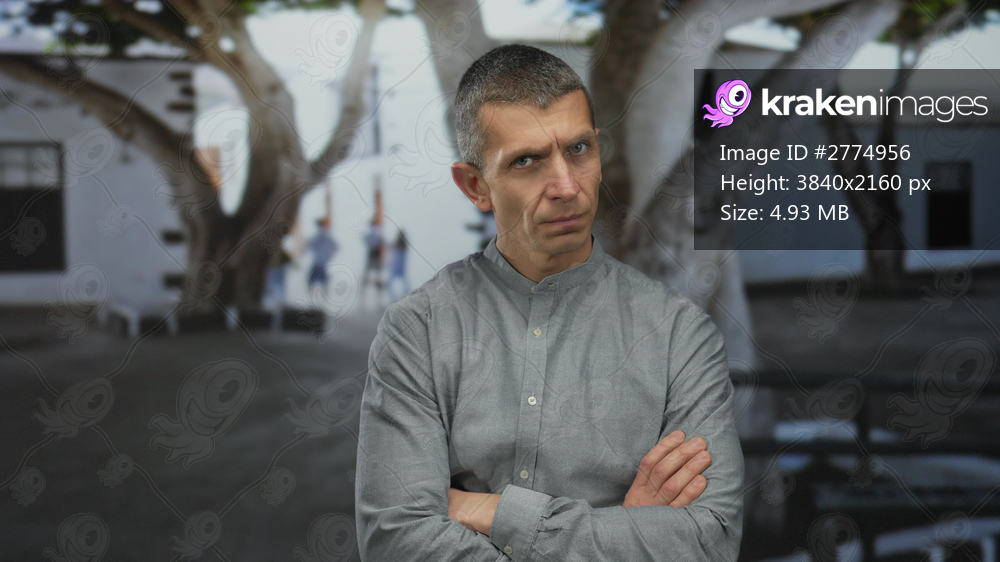 Man standing outdoors with arms crossed under tree-lined street, displaying contemplative expression against urban backdrop with blurred people in background. - Kraken Images