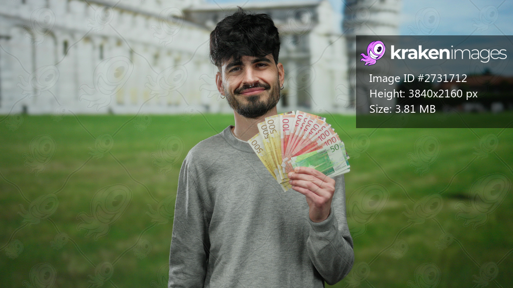 Man standing outdoors in front of pisa tower in italy holding colorful norwegian banknotes with a confident expression against a lush green lawn and ancient architecture. - Kraken Images