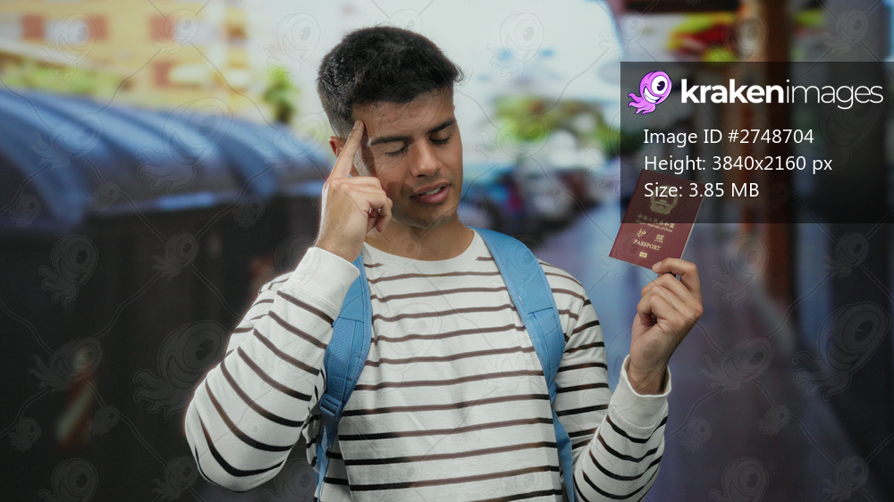 Man standing outdoors on a city street touching head with finger while holding a chinese passport, wearing striped shirt and blue backpack, suggesting travel planning. - Kraken Images