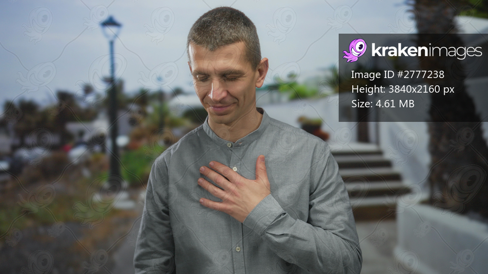 Man standing outdoors on a street wearing a gray shirt with a smile, surrounded by palm trees and steps, radiating warmth and positivity in a peaceful urban setting. - Kraken Images