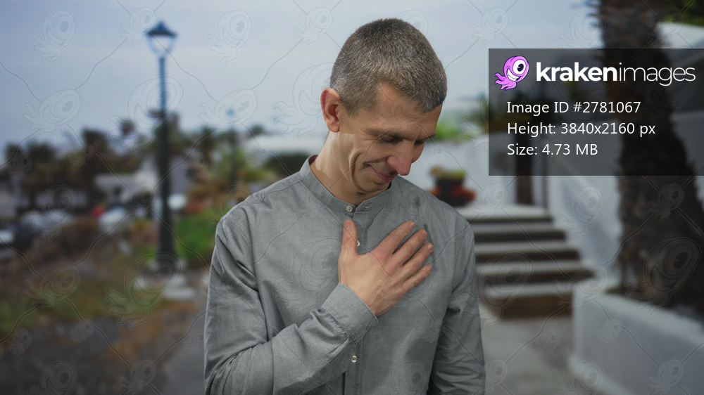 Man standing outdoors on a street wearing a gray shirt with a smile, surrounded by palm trees and steps, radiating warmth and positivity in a peaceful urban setting. - Kraken Images